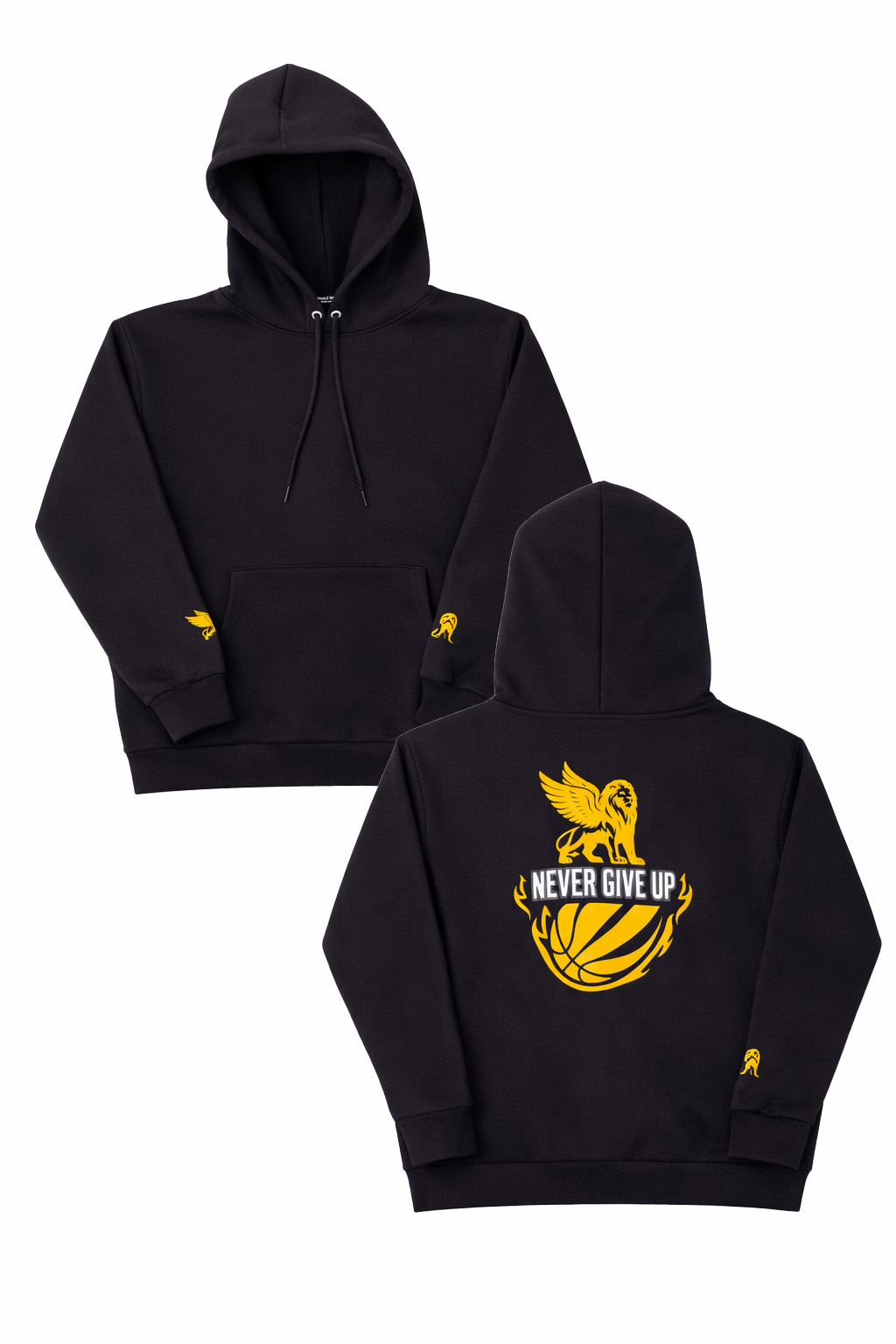 Built for the grind and the sidelines, the Kings United “Never Give Up” Hoodie features a high-impact back graphic of our signature winged lion atop a flaming basketball. This sleek black hoodie is crafted from a soft cotton-blend fleece, offering maximum warmth and a relaxed fit that’s perfect for post-game recovery or street style. With subtle gold branding on the cuffs and a reinforced kangaroo pocket, it’s a durable, everyday staple that reminds you to stay relentless on and off the court.